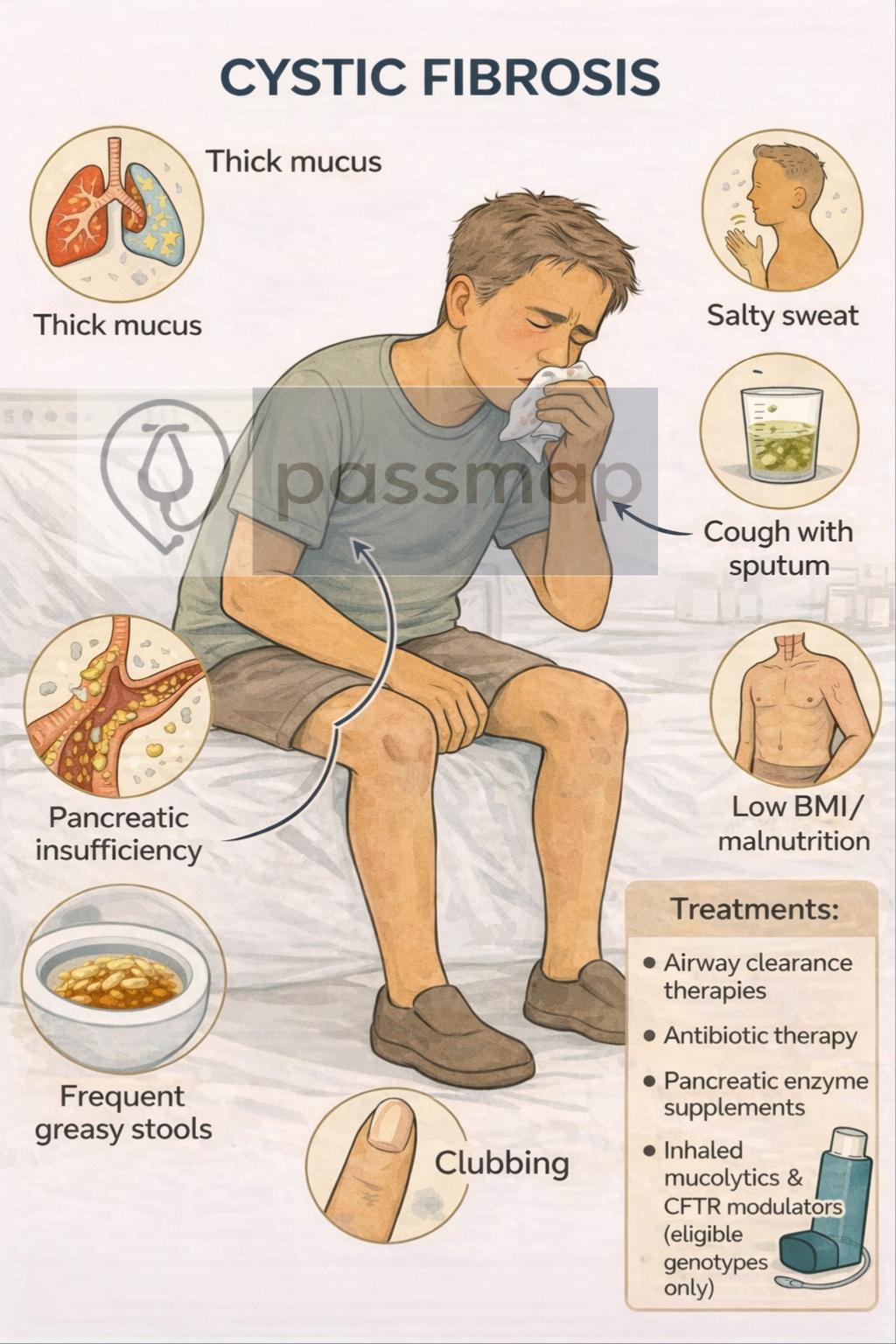 💡 Autosomal recessive CFTR mutation → thick, sticky secretions