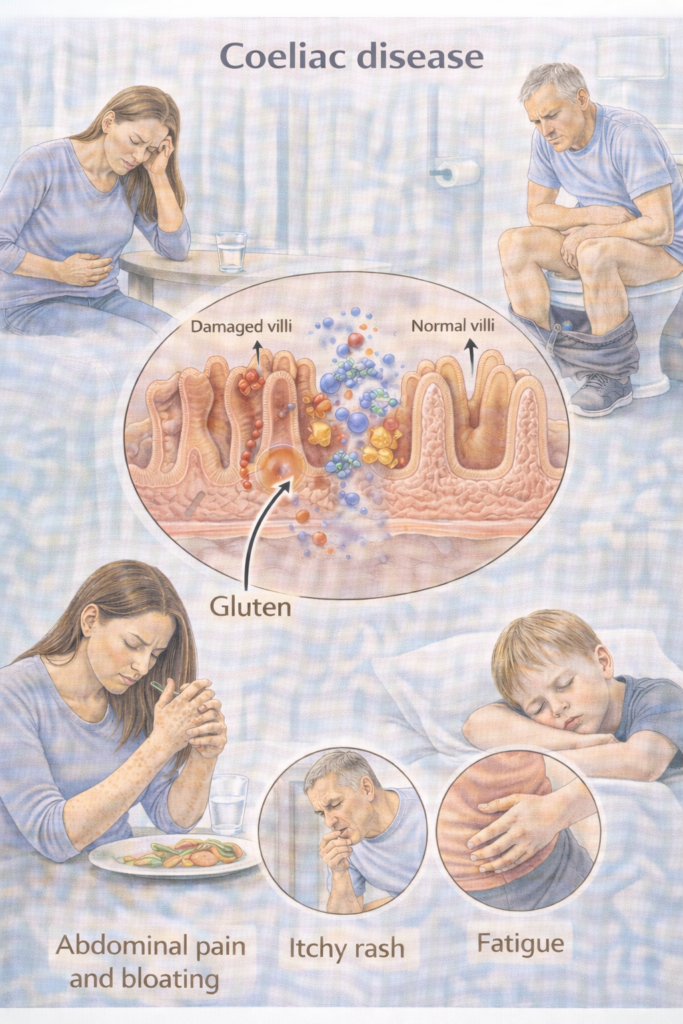 | ⚡ Urgent GI | Positive serology, unexplained IDA/weight loss, persistent diarrhoea, dermatitis herpetiformis | GI/dermatology clinic; arrange OGD + biopsies (adults) |