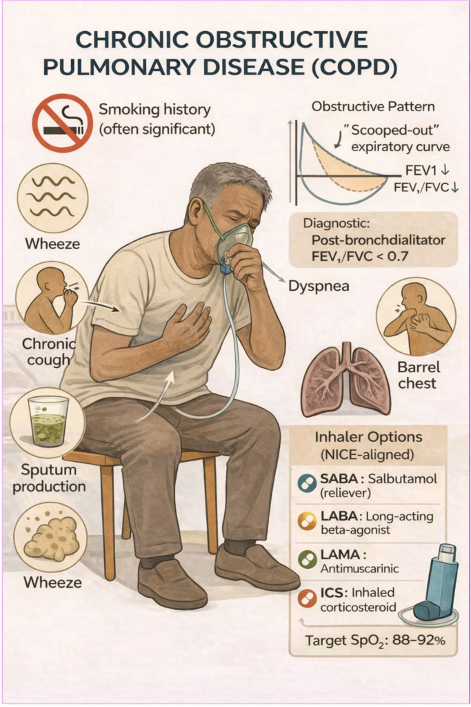 💡 Post-bronchodilator FEV₁/FVC < 0.7 confirms COPD